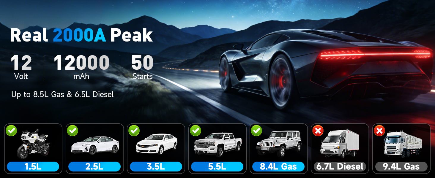 All-in-One 2000A Jump Starter & 160 PSI Air Compressor – Powerful 12000mAh battery delivers genuine 2000A peak current to restart dead 12V vehicles (up to 8.5L gas/6.5L diesel). Integrated high-pressure compressor inflates 195/65R15 tires from 0 to 36 PSI in just 5 minutes. Provides up to 50 jump starts per full charge.