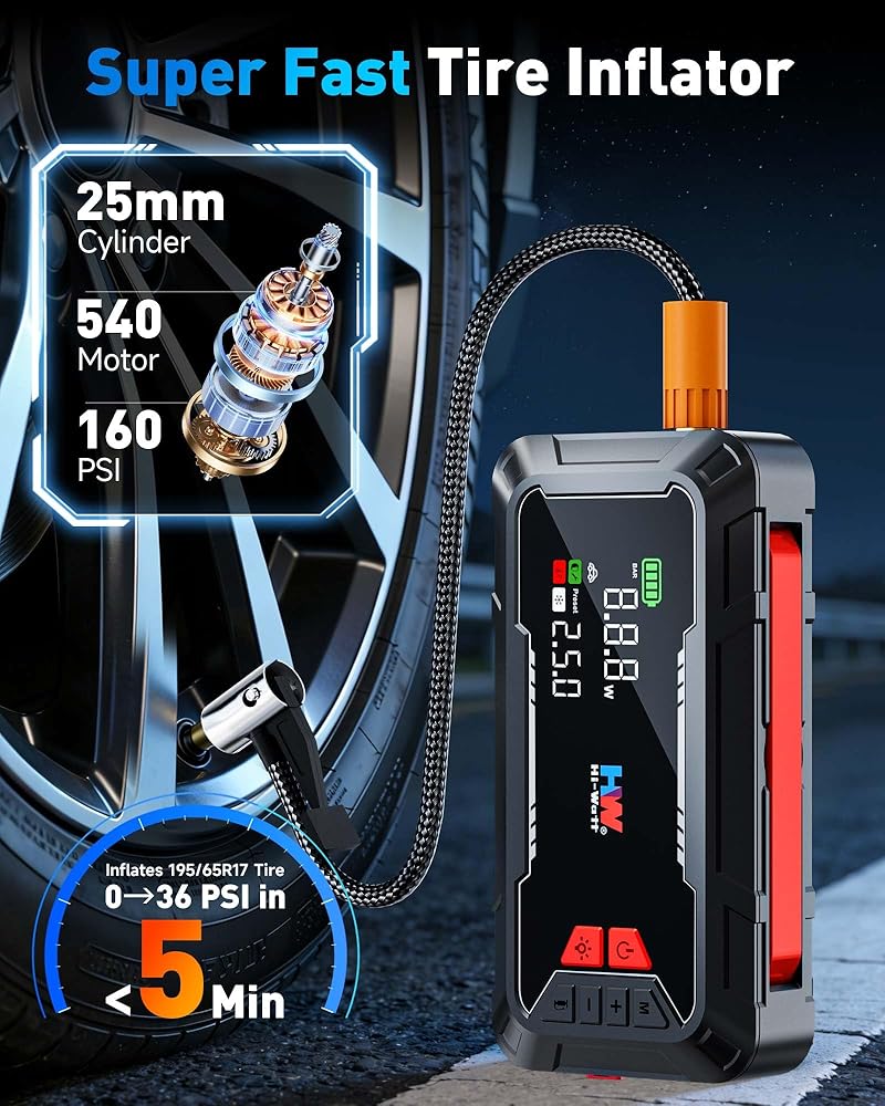 HW Car Battery Jump Starter with Air Compressor, [44.4Wh, 160PSI] True 2000A Portable Car Jumper Pack (8.5 Gas/6.5L Diesel), 12V Jump Box with Jumper Cables/Air Chucks/USB-C Cables-65W Fast Charging