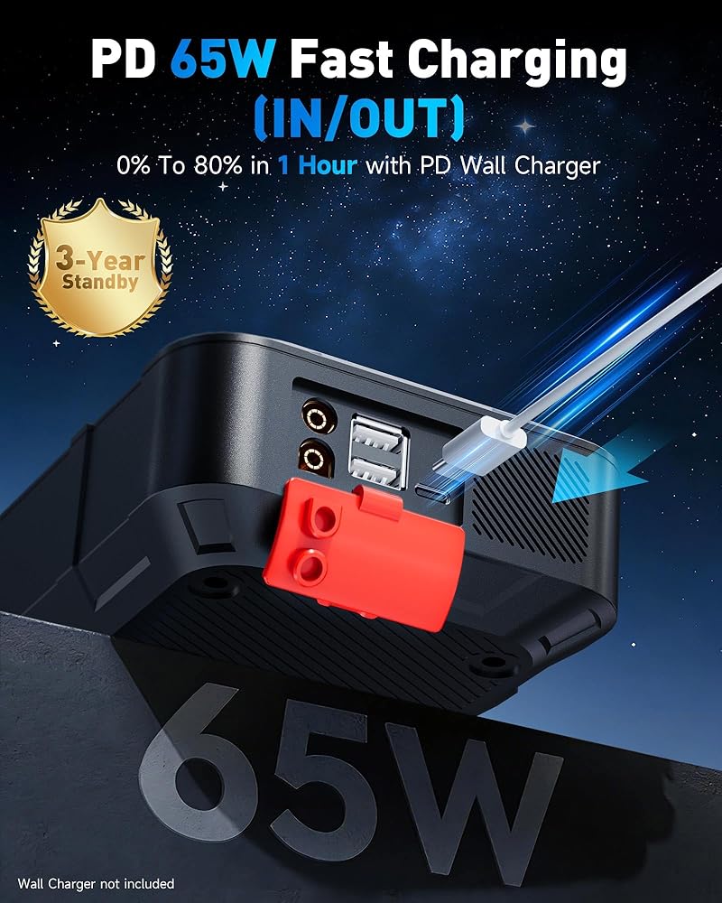 65W PD Two-Way Fast Charging Power Bank – USB-C 65W PD port supports both input and output: charge the X8 from 0 to 90% in 1 hour with a PD charger, or use it to fast-charge laptops and phones. Two USB-A 18W QC ports allow simultaneous device charging. Ultra-low standby consumption keeps it ready for up to 3 years.