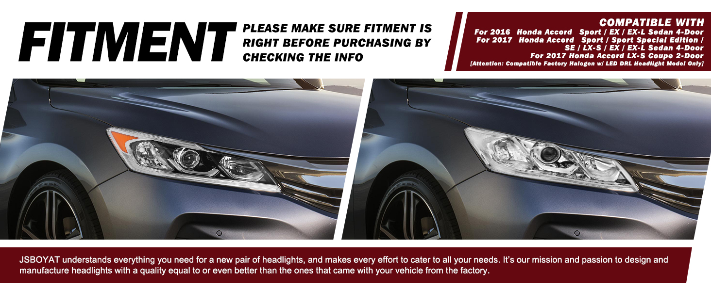 【VEHICLE COMPATIBILITY】Headlights Assembly Compatible With 2016 2017 Honda Accord Sedan. High beam bulb type: 9005 (Not Included); Low beam bulb type: H11 (Not Included); Signal light: 7444NA (Not Included). DRL: LED (Included); OEM Part Number: 33150-T2A-A81, 33100-T2A-A81, HO2502169, HO2503169.