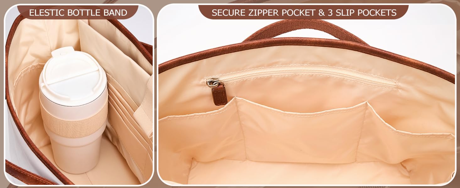 MULTI FUNCTION: Interior a smooth, water-resistant lining. 1 Large compartment for work documents or gym clothes after work. 3 quick-access slip pockets for phone, mouse, or laptop charger. 8 card slots for IDs, credit cards, and transit passes. 1 13" slim laptop padded sleeve protects laptop during commute or travels. 1 key fob leash keeps car or home keys right where you need them. 1 elastic bottle holder snugly fits Stanley tumbler or standard water bottle, keeping it upright and spill-free.