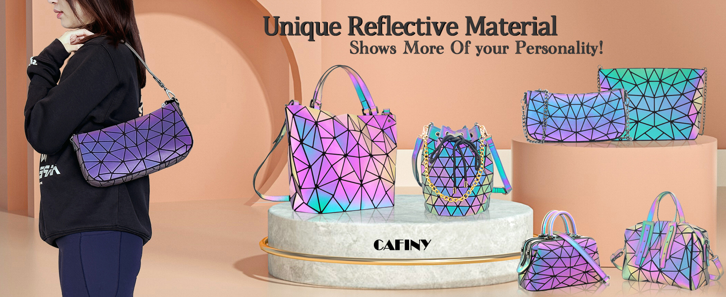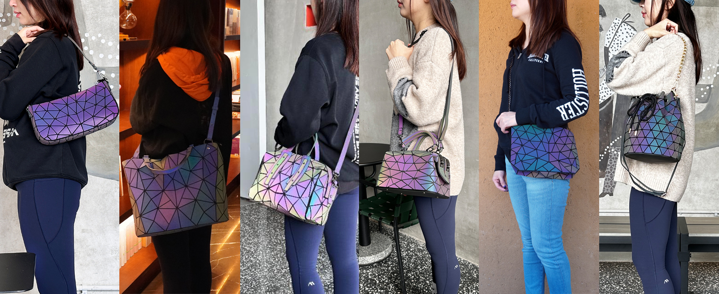 Holographic fashion design: The geometric luminous bags is dark gray in normal light, When illuminated by the light in different angles or distance that will appear amazing colors. You will like this interesting design