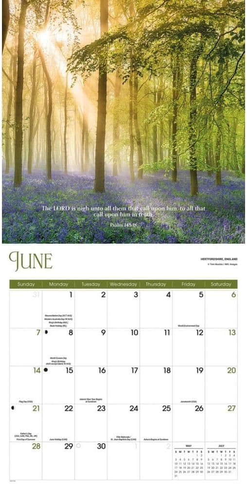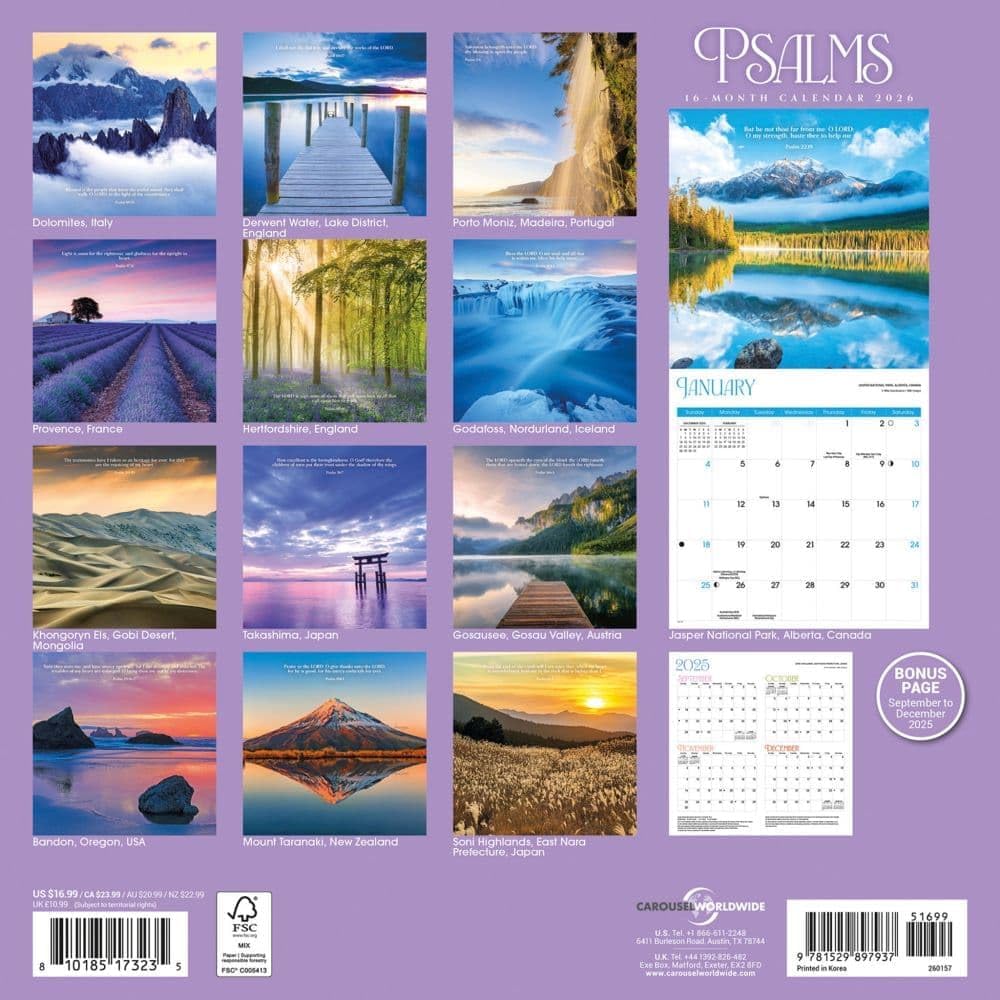 The Psalms Special Value 2026 Wall Calendar is a 16-month wall calendar that features a collection of monthly images depicting stunning global landscapes, breathtaking natural scenery, and serene outdoor environments. Each month highlights settings that encourage spiritual reflection, daily renewal, faith-based inspiration, and tranquil contemplation. Every image is paired with a carefully selected verse from the Book of Psalms, providing spiritual guidance and inspiration alongside the landscape photography. This calendar measures 12" x 12" when closed and 12" x 24" when open. It features a spacious monthly grid starting from December 2024, beginning on 8/31/2025, and includes major U.S. holidays and moon phases for practical reference. The wall format is designed for easy placement and organization in a variety of spaces. Constructed with high-quality, plastic-free paper and a durable stapled binding, the calendar is produced using eco-friendly methods. The design supports both visual enjoyment and practical scheduling throughout the 16-month period. This calendar serves as an organizational tool and a reference for important dates and spiritual reflection.