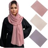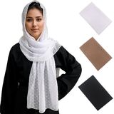 MiaoChoice 3 Pack Jacquard Bubble Chiffon Hijab Set. Each hijab is made from soft, lightweight chiffon that's airy and comfortable, ideal for daily wear or special occasions. The unique jacquard texture and playful pom pom dotted edges bring a fresh, fashionable touch to traditional hijab styling. With 3 complementary colors in one set, you'll always have the perfect hijab to match your outfit and mood. Perfect for Muslim women who love style and comfort, or as a thoughtful gift for someone special.