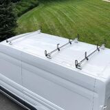 The Vantech Heavy Duty 3 Bar Ladder rack is brand new in original packaging. Our rack is made of high-quality durable steel. The steel is galvanized with a powder coated finish. Crossbar length: 65 inches with 64 inches of space once installed. Crossbars are protected by plastic bar guards. The total height is 11 inches with ladder stoppers and side supports, 5.5 inches without. Accessories can be removed to form a flat loading space. We provide rubber gaskets to put between the roof and the ladder rack so there is no metal-to-metal contact. This rack allows you to carry ladders, cargo boxes, surfboards, kayaks, solar panels, and lumber. Can support weights up to 750 lbs. (evenly distributed). Included: Hardware and instruction manual for installation. Professional installation is recommended but not required. Fitment: Ford Transit Cargo High Roof. No DRILLING IS REQUIRED.