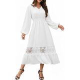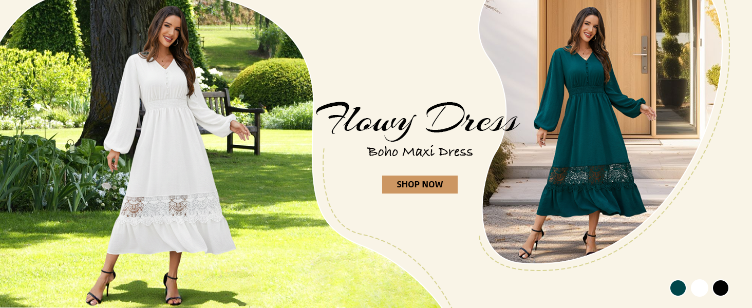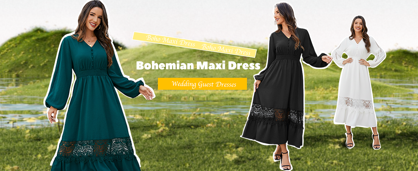 Elegant and Flowy: This boho maxi dress showcases a flattering V-neckline, delicate lace accents, and charming decorative buttons for a sophisticated touch. The smocked waist and long sleeves ensure comfort and a graceful fit for all body shapes.