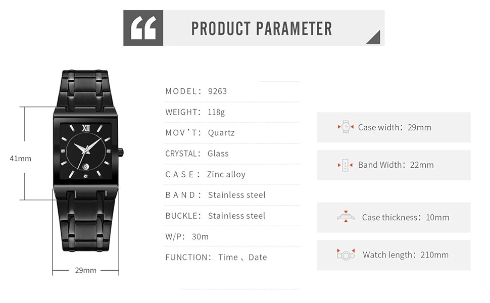 Japanese-quartz movement provides accurate timekeeping and Battery service life of more than 1 year.Using watch plating technology is extremely durable. Wear-resistant and scratch-resistant mineral glass lens, exquisite.