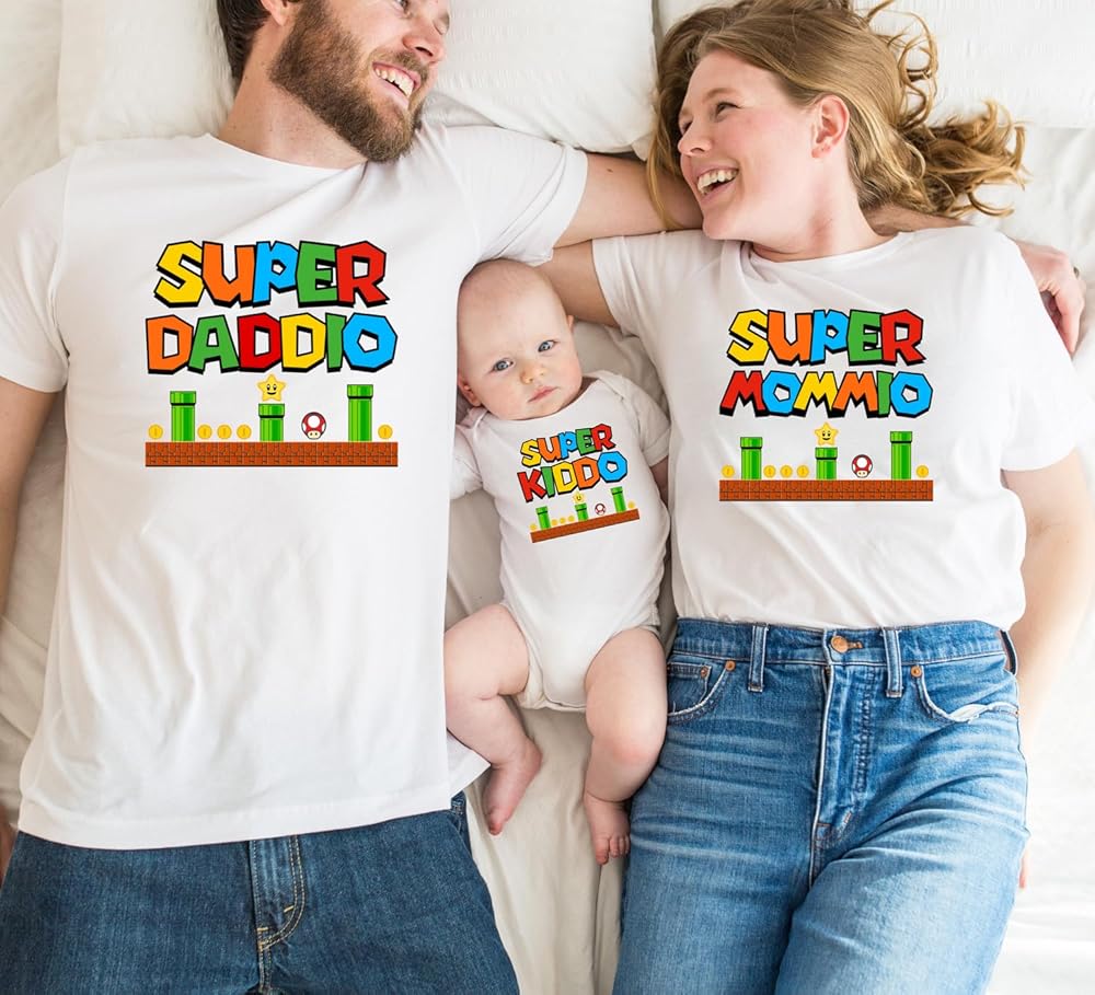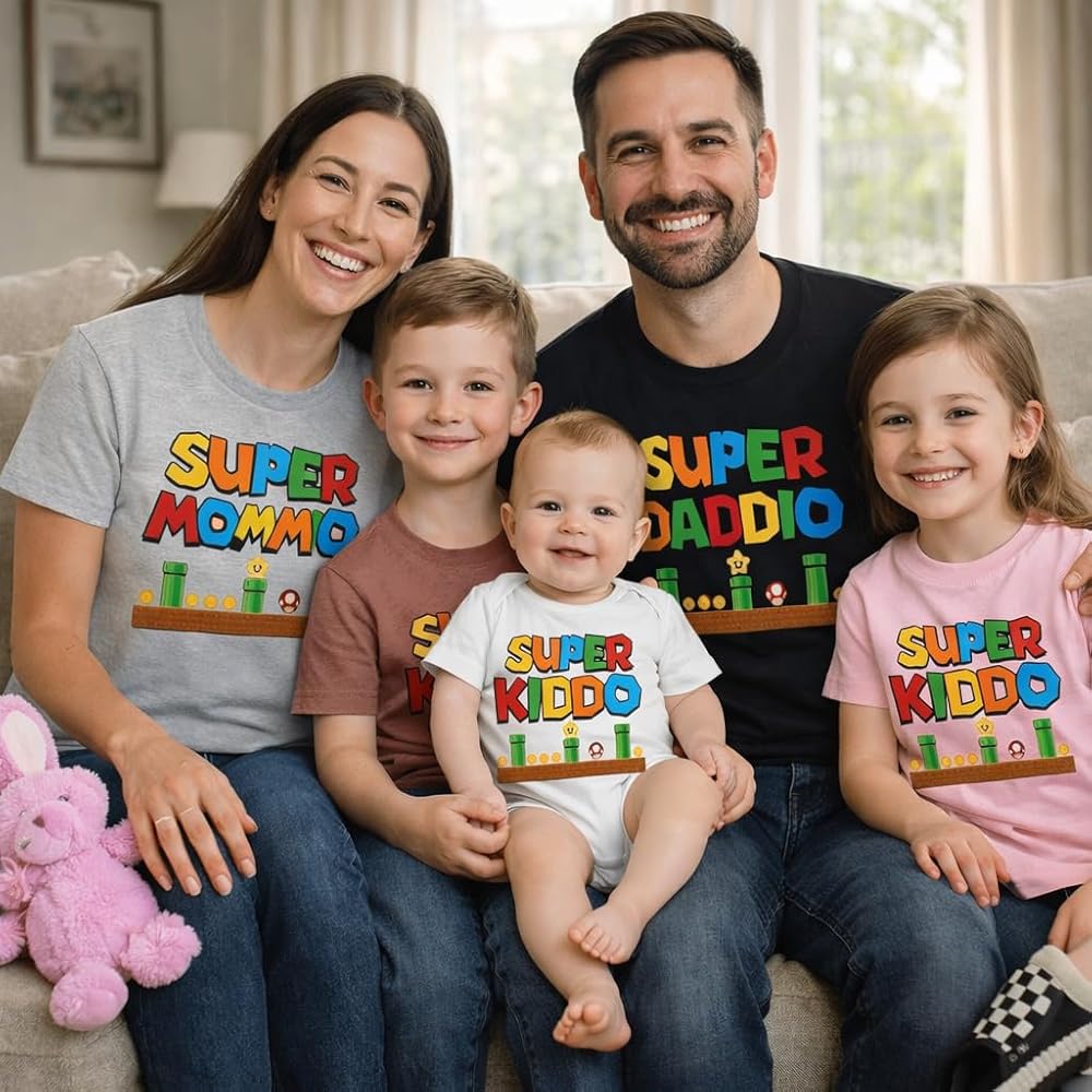 Level up your family style with these Super Dad, Mom, and Kiddio Matching T-Shirts! Inspired by classic video game themes, these fun and stylish shirts bring a playful touch to any family gathering, game night, or casual outing. Whether you're celebrating a birthday, Father's Day, Mother's Day, or a family trip, these matching family tees make a great gift for gamers and parents alike. Sizes & Age Range Baby Bodysuits (0–24 Months) Toddler Tees (2T–5T) Youth Sizes (Small–XL, fitting ages ~4–14) Adult Sizes (S–3XL, plus-size friendly) Quality & Comfort We take pride in providing soft, breathable fabrics that stand up to playful kids and festive adults. No more itchy or stiff t-shirts—enjoy a smooth, lightweight feel perfect for lively birthday parties, photoshoots, or everyday wear. Product Details: Solid colors like black, white, and pink are crafted from 100% cotton. Heather colors are a blend of 60% cotton and 40% polyester. How to Customize Select Design & Size: Choose from our listing options or message us for special requests. Why Choose Us? Handmade Expertise: Each shirt is carefully designed and produced, reflecting our passion for quality and creativity. All Ages & Genders:All of our shirts are Unisex. Fast & Friendly Service: Quick turnaround times, reliable shipping, and responsive customer care.