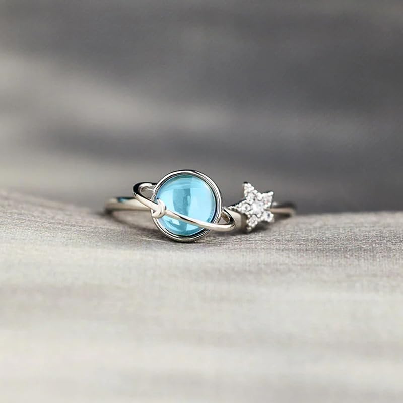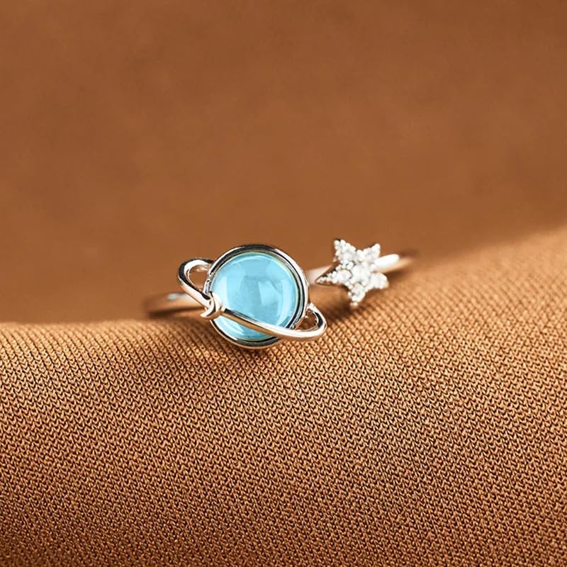 Celestial Planet & Star Design: Inspired by the beauty of the cosmos, this planet and star ring features a shimmering blue Saturn with an orbital ring and a sparkling cubic zirconia star. The combination of cosmic charm and delicate detailing creates a unique and eye-catching design that captures the magic of the universe.