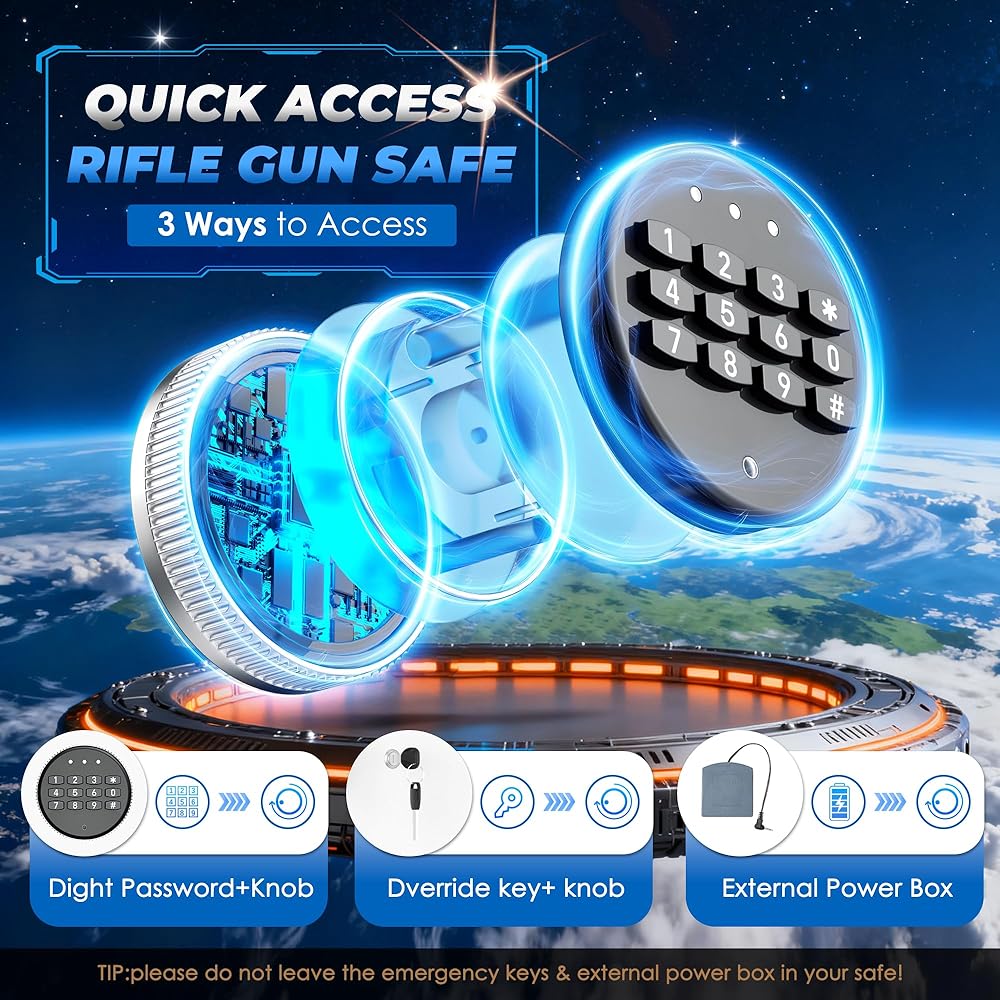 ✅【Three Ways to Open Gun Safe for Rifle and Shotguns】①Digital keyboard + Knob ②Key + Knob ③Emergency battery box + Knob, three ways to open, multiple locking system, more effective protection of firearms safety.