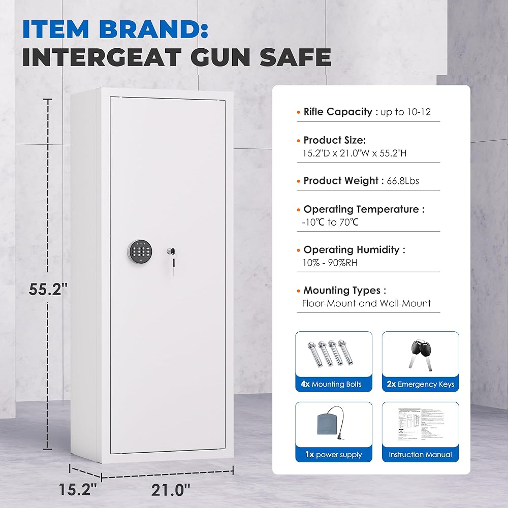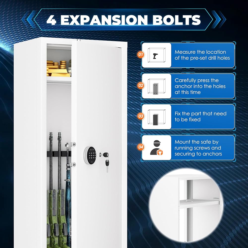 ✅【All steel structure】The gun safes are made of cold rolled steel. Four 20mm lock bolts increase safety, anti-pry, and anti-theft. For added safety, please use the 4 expansion bolts provided to fix the gun cabinet to the wall or floor.