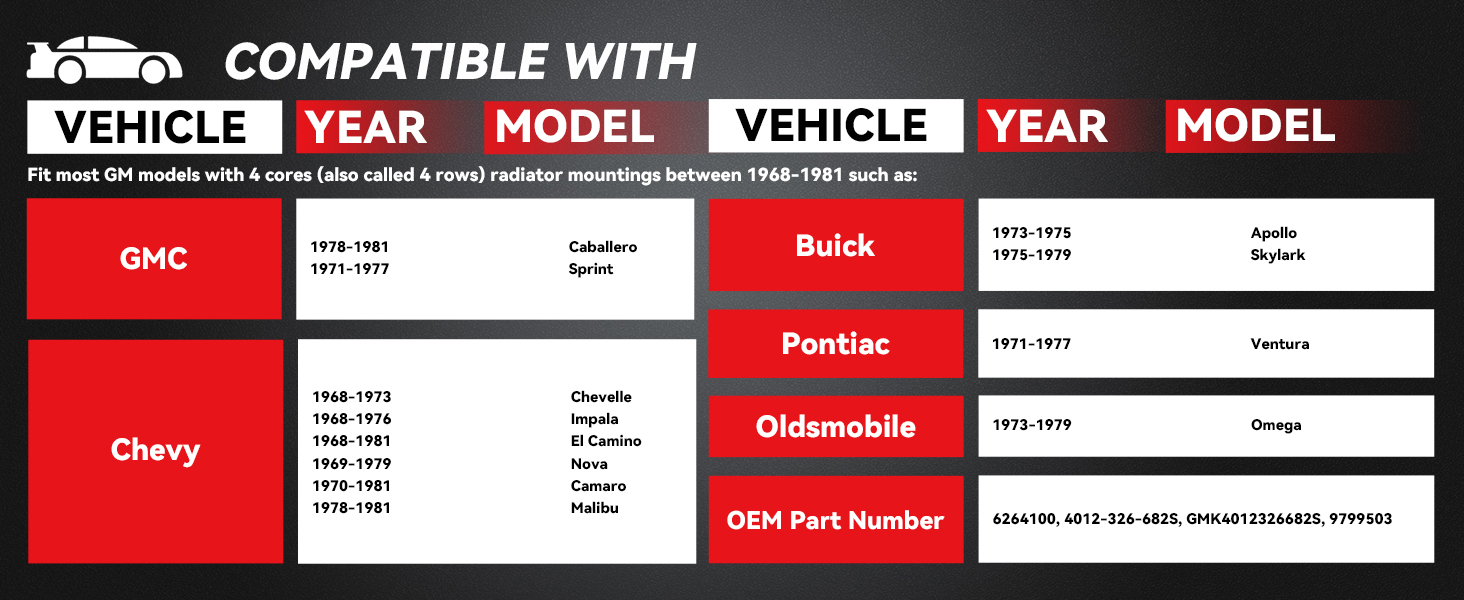 [Fitment Guide]: Compatible with GM vehicles with 4 core radiators (also called 4 row). Please check Amazon's fitment filter to confirm if this item will fit your vehicle