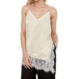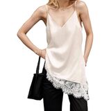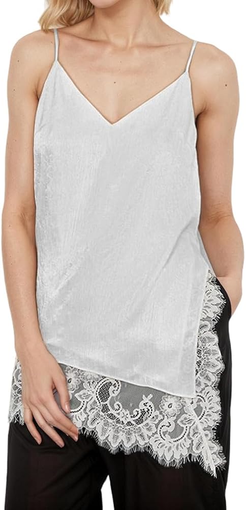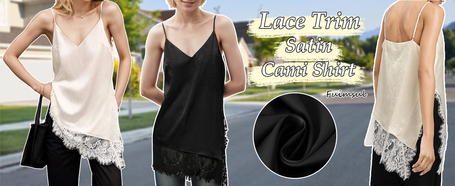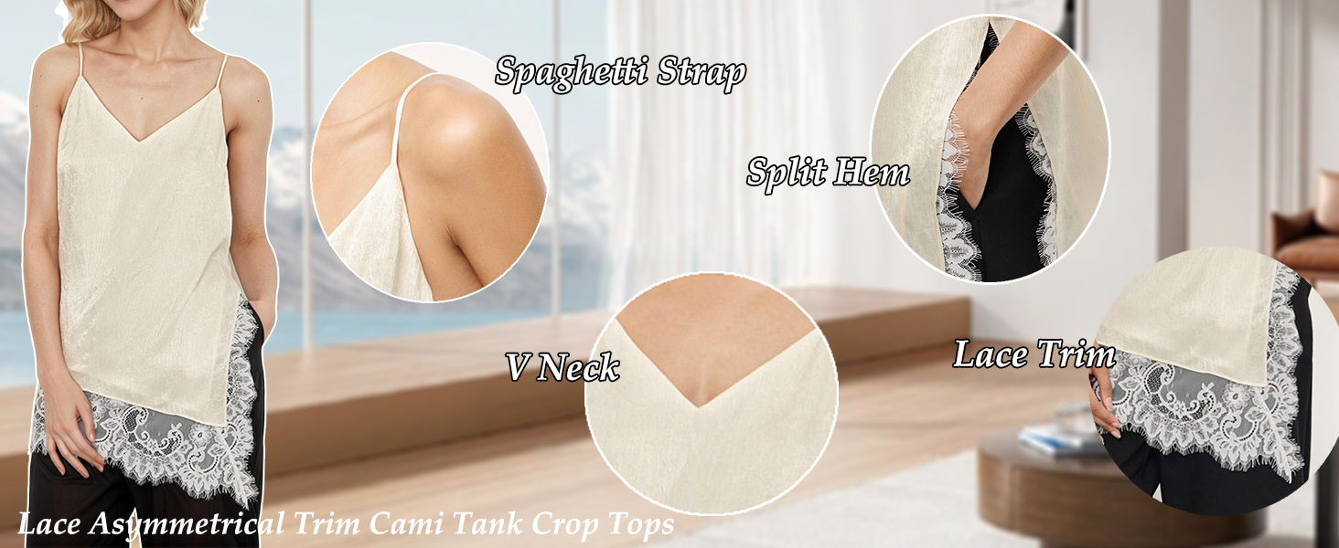Tips: S/M/L. Please read our description size to choose before ordering. Hand wash,do not dry clean. Ladies trendy silk satin asymmetrical spit hem lace cami top, women satin lace trim cami tops, silk v neck adjustable spaghetti strap tank top for women