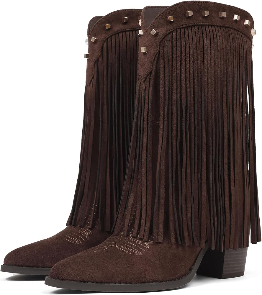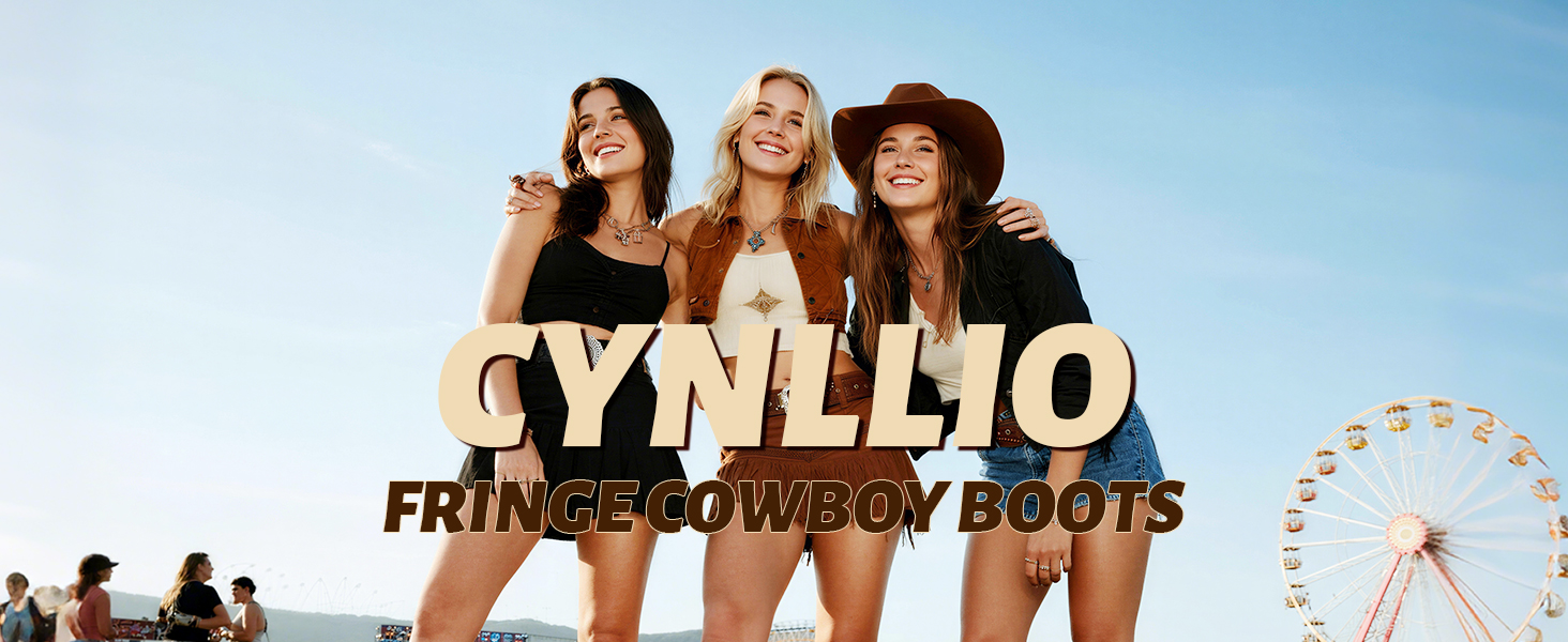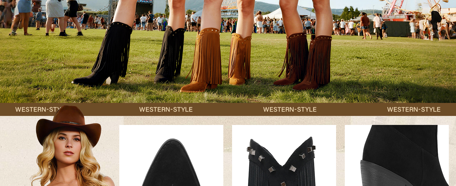 [Fringe Cowboy Boots]: Eye-catching and flowing fringe sways with every step, infusing a dynamic energy into the overall look and easily becoming the center of attention in the crowd.