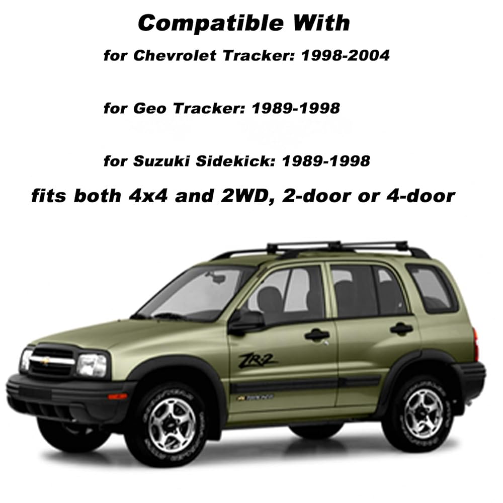 • Vehicle Compatibility: Fits for Chevrolet Tracker (1998-2004), for Geo Tracker (1989-1998), for Suzuki Sidekick (1989-1998), and related models like Suzuki Samurai; compatible with 4x4 or 2WD, 2-door or 4-door, all engines, and all trim levels, including ZR2.