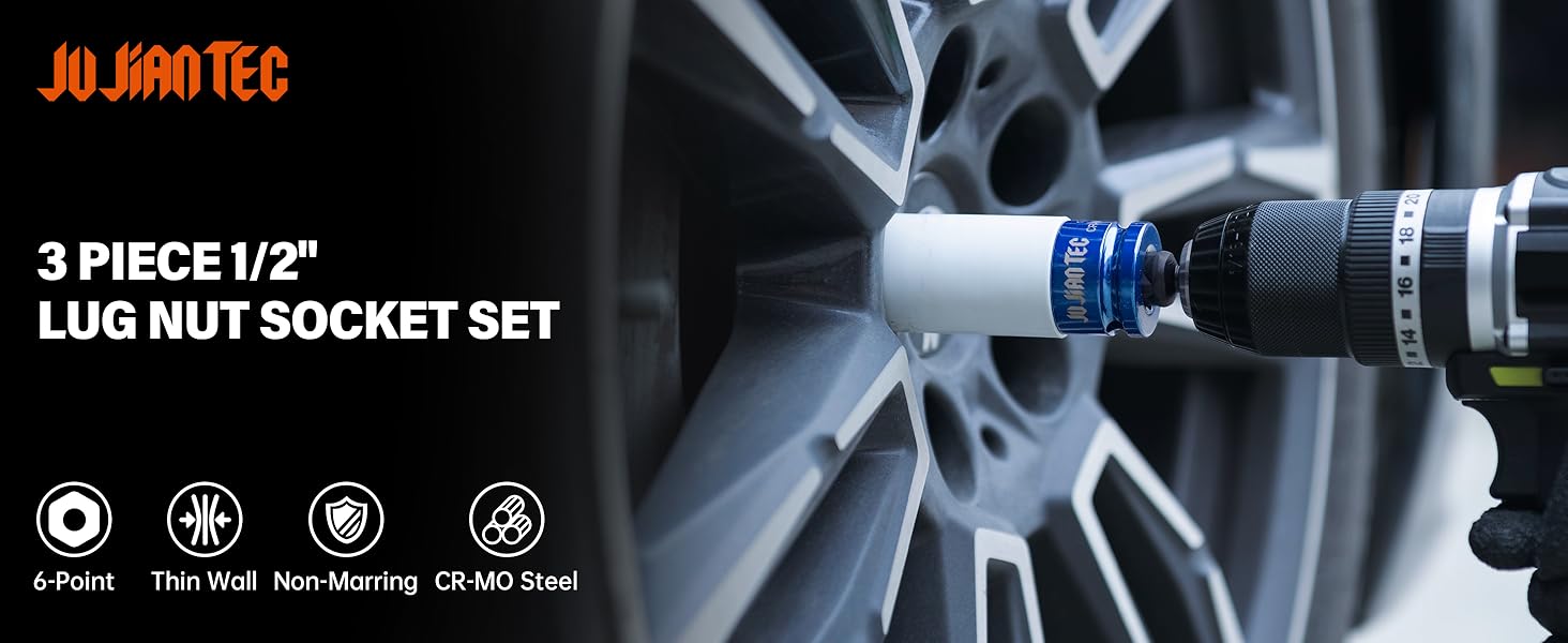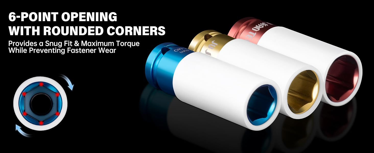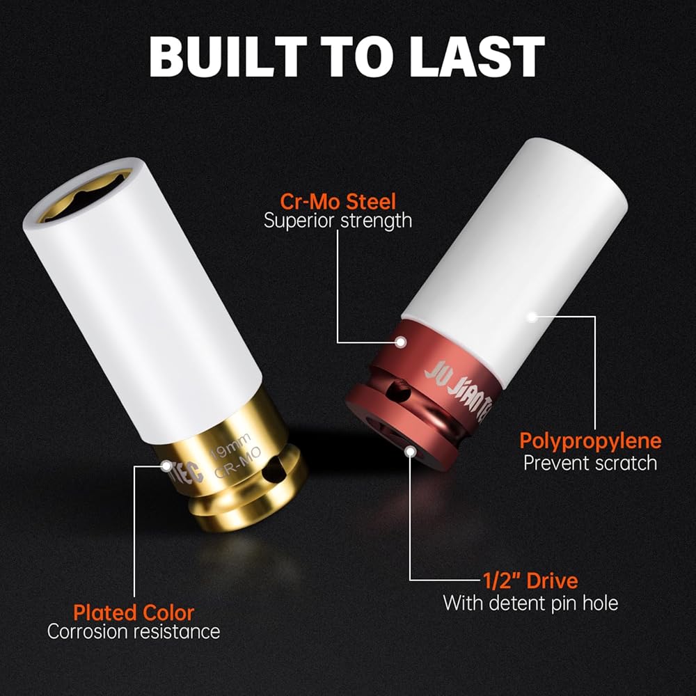 【SCRATCH-FREE】 Each socket is fitted with a 360-degree rotating non-marring nylon sleeve and an internal protective collar, creating a complete scratch-proof system for your alloy wheels, bolt tops, and lug nuts during tire changes. Professional Tip: For wheels with exceptionally narrow lug wells, please verify the socket's outer diameter prior to use to ensure optimal access and performance.