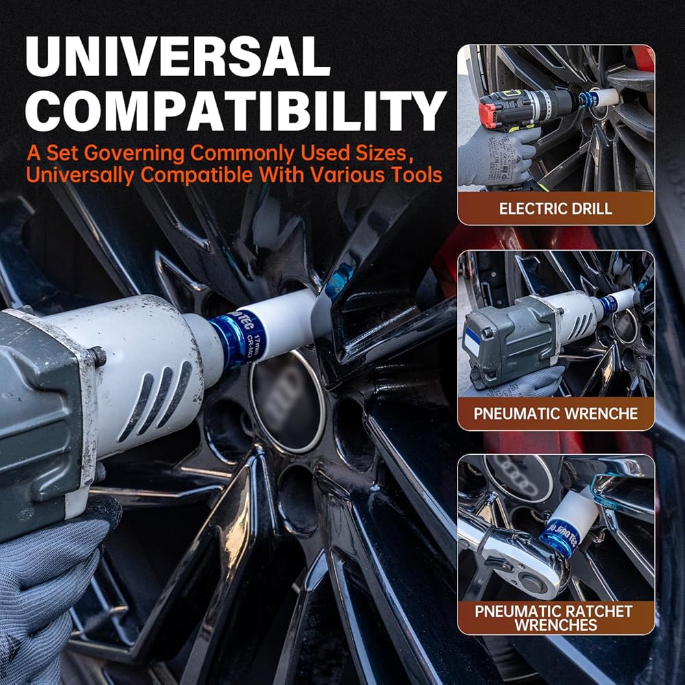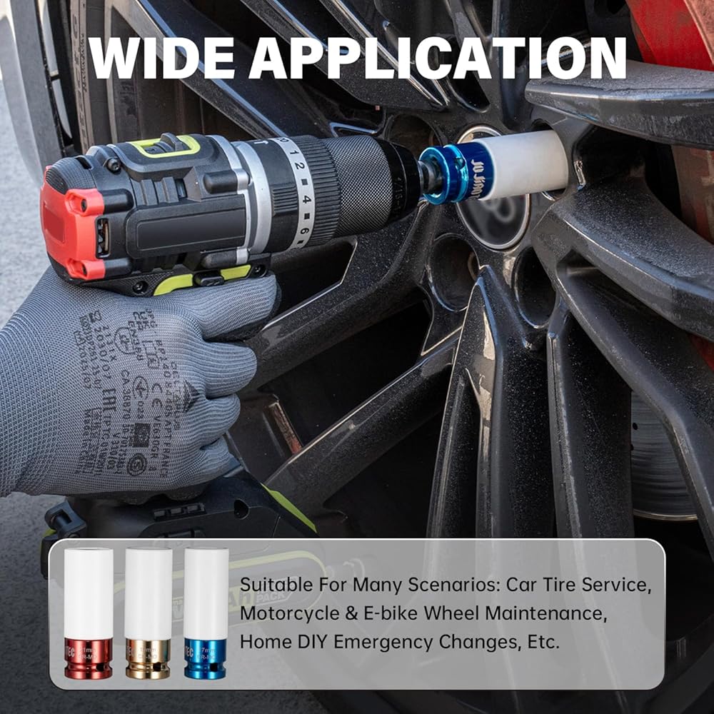 【WIDE COMPATIBILITY】 Covering the most essential metric sizes (17mm, 19mm, 21mm), this 3-piece impact socket set is designed to service lug nuts on the vast majority of cars and light trucks. Its versatile design guarantees compatibility with all 1/2-inch drive tools, while the extended hollow shaft and secure 6-point grip ensure safe and effective lug nut removal.