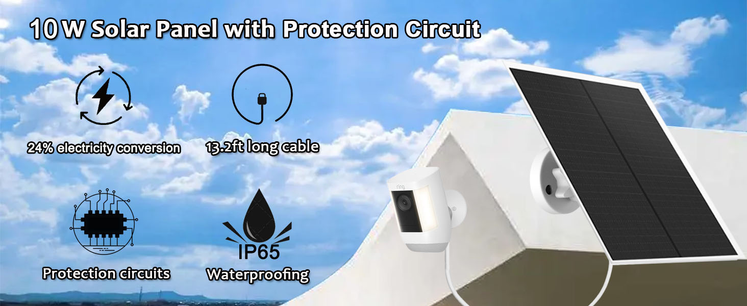 1. 【Compatibility】This 10W/5V Solar Panel Charger,for Ring Camera, is compatible with Ring Spotlight Cam Battery, Stick Up Cam Battery, Stick Up Cam Pro Battery, Spotlight Cam Plus Battery, Spotlight Cam Pro Battery and Reolink Reolink Argus Pro and other brands with built-in rechargeable batteries cameras. In addition, in addition to being compatible with Ring brand camera models, this solar panel can also be compatible with other brands' built-in battery cameras suitable for Type-C or DC (3.5x 1.35) charging ports.