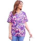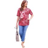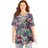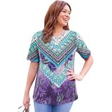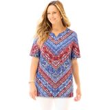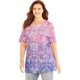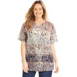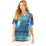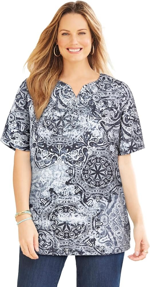 The contrasting print of this top is all about eye-catching style that can have you fashionably dressed for day or night. The neckline is embellished with charming crochet and sparkling studs for extra feminine flair.FABRIC: Super-soft and smooth knit with comfortable stretch.FIT: Relaxed, easy silhouette. Notched neck. Short sleeves.