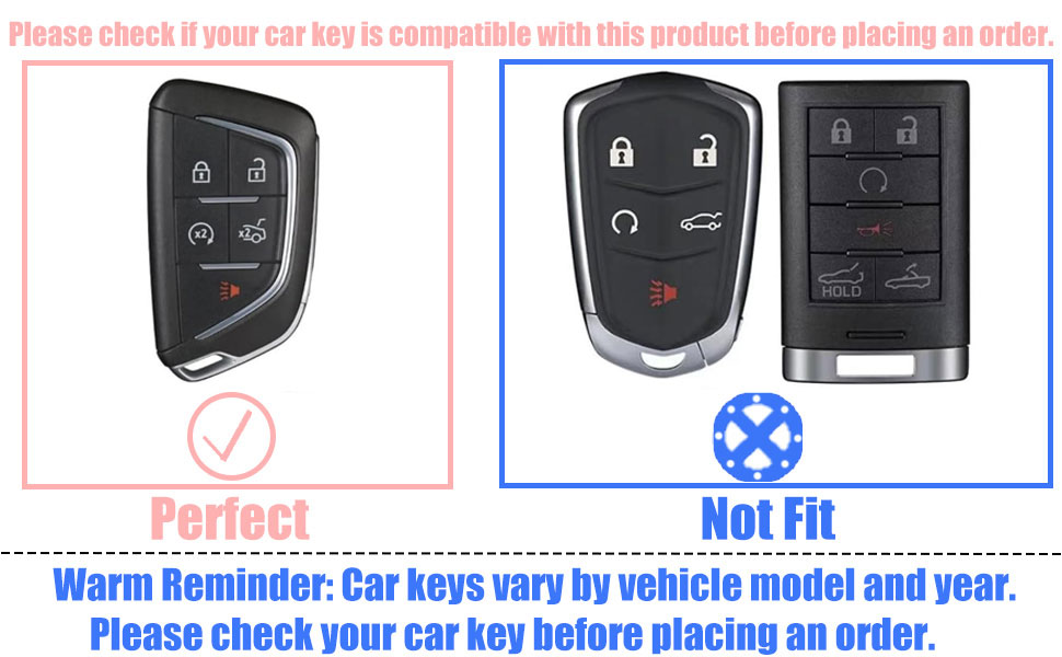 Fits Key Model: The key fob cover is compatible with Cadillac Escalade 2020-2023 CT4 CT6 CT5 XTS XT4 XT5 ATS 5 buttons smart key. The model is only for reference, please DOUBLE CHECK your key shape and button labels carefully to make sure it is the same as the second picture.(NOTE: same brand car may have different car key model.)