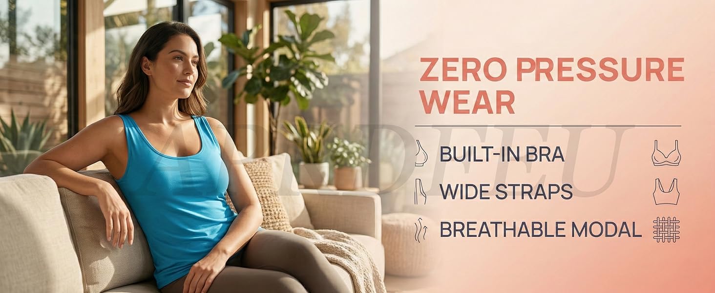 Built-In Bra for Light Support:Designed with a built-in padded bra that provides gentle support and coverage without the need for an extra bra. Removable pads offer customizable comfort for daily wear, lounging, or light workouts.