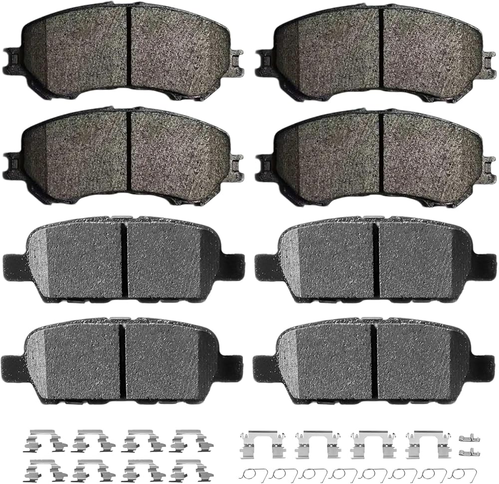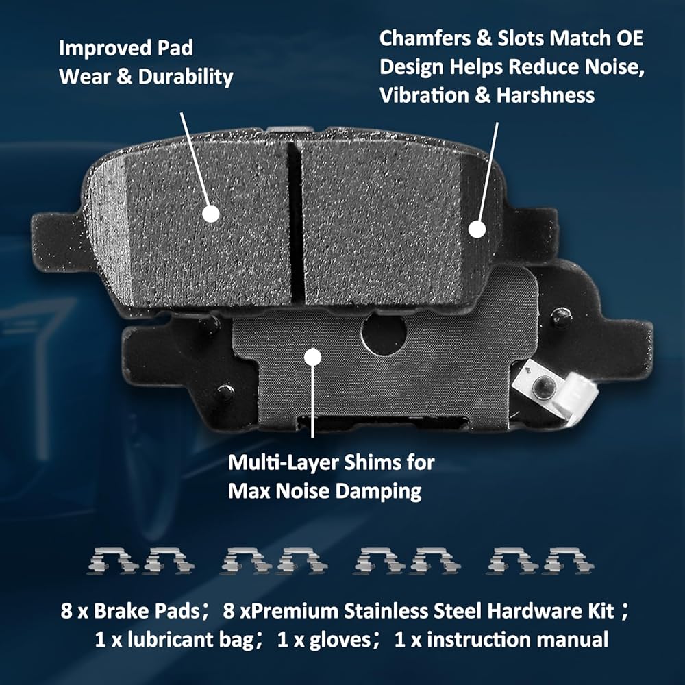 【Basic Info.】Replaces Number:D785-7653 D792-7700;The product package contains 8 Pieces Front and Rear Brake Pads,Premium Stainless Steel Hardware Kit Included,1 x lubricant bag, 1 x gloves and 1 x instruction manual