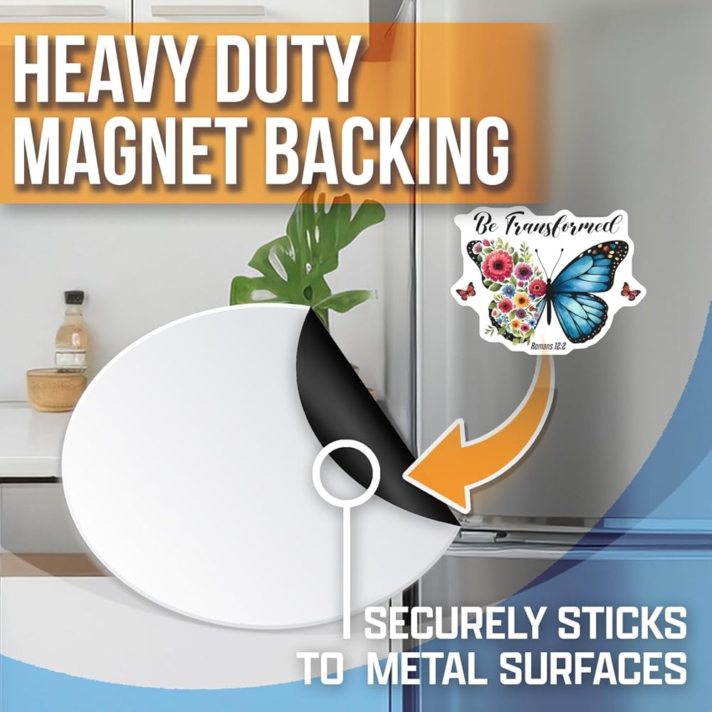 This beautiful "Be Transformed" butterfly magnet features a vibrant floral design and an inspirational quote from Romans 12:2. Perfect for adding a touch of motivation and beauty to your fridge, locker, or any magnetic surface. This inspiring Christian gift is a daily reminder of transformation and renewal, making it a thoughtful present for friends and loved ones.