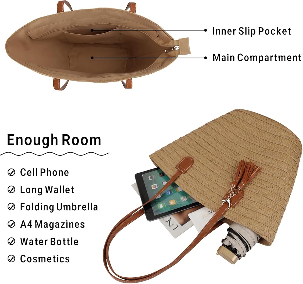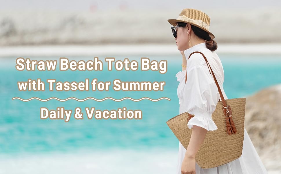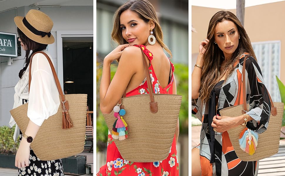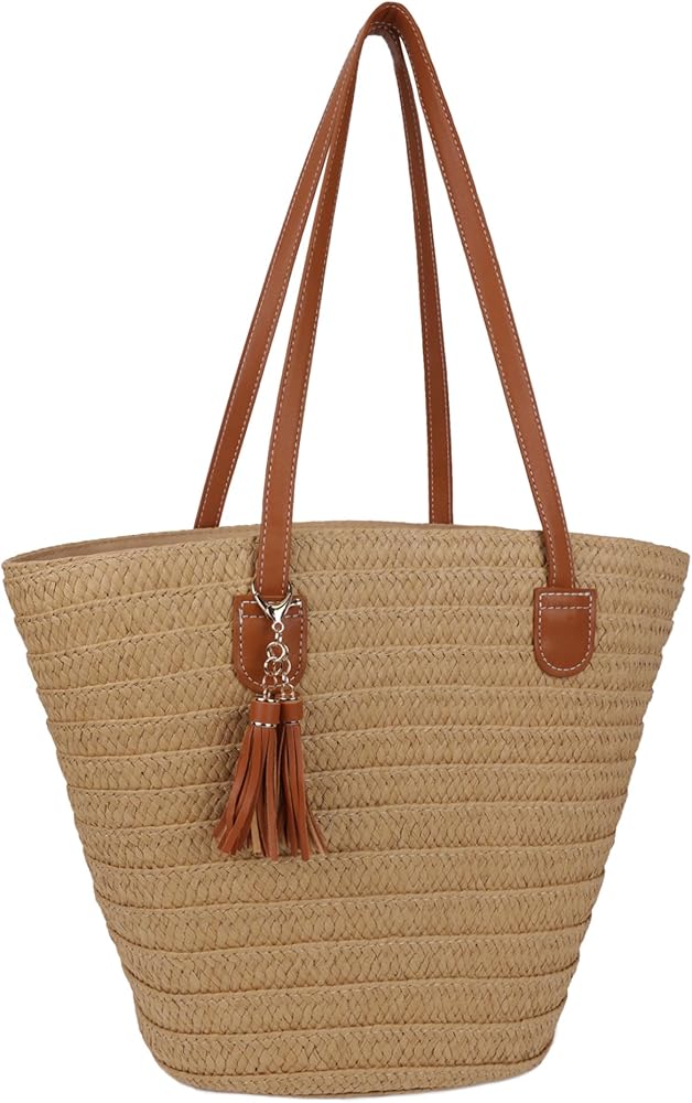 Stylish Design: The straw tote bag features a trapezoid design, brown faux leather handles and tassel charm, which make this bag look effortlessly stylish