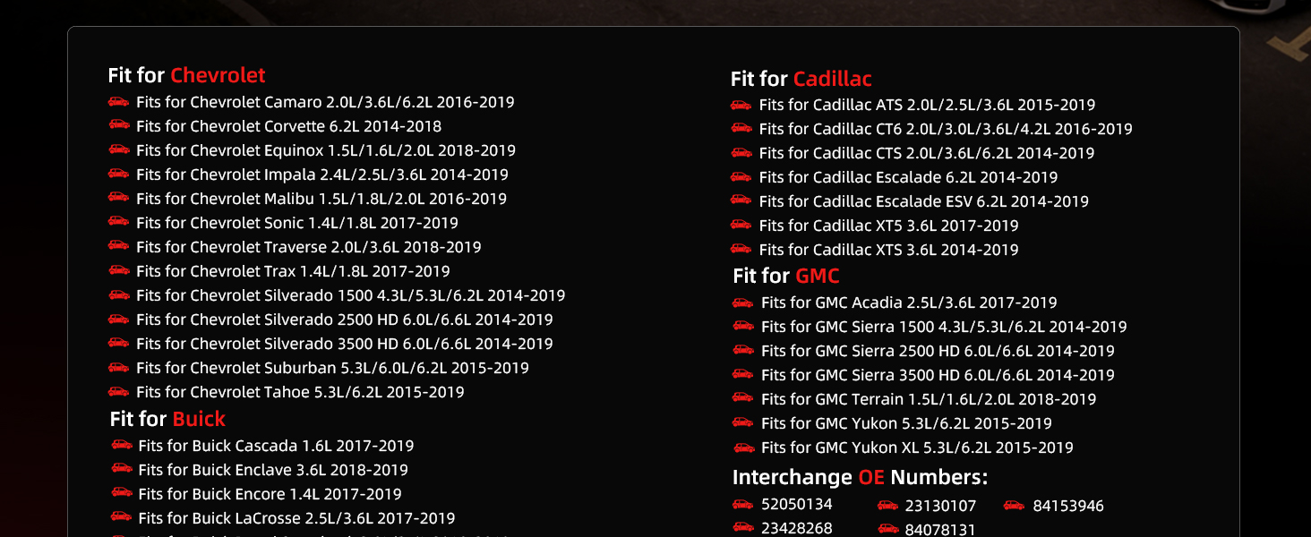 [Compatible Model]: Backup Sensors fits for Chevrolet Sonic/Trax 1.4L/1.8L 2017-2019, for Traverse 2.0L/3.6L 2018-2019, for Silverado 1500 4.3L/5.3L/6.2L 2014-2019, for Silverado 2500 HD/Silverado 3500 HD 6.0L/6.6L 2014-2019, for Suburban 5.3L/6.0L/6.2L 2015-2019, for Tahoe 5.3L/6.2L 2015-2019, for Camaro 2.0L/3.6L/6.2L 2016-2019, for Corvette 6.2L 2014-2018, for Equinox 1.5L/1.6L/2.0L 2018-2019, for Impala 2.4L/2.5L/3.6L 2014-2019, for Malibu 1.5L/1.8L/2.0L 2016-2019