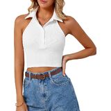 Material: This halter tops for women made of 90% polyester and 10% elastane, soft, textured and a little stretchy, comfortable to wear, ideal for summer, the white is definitely a little see-through. If you want a more form-fitting look, recommend sizing down