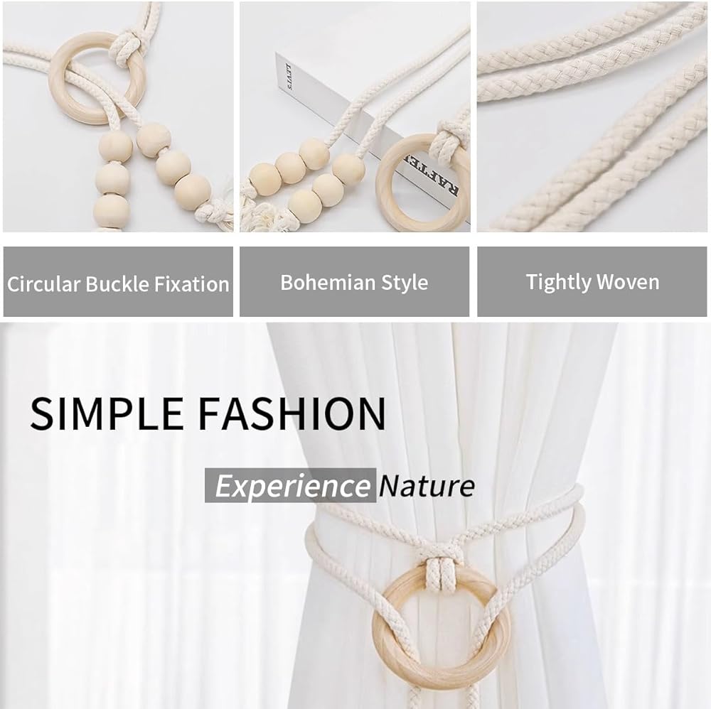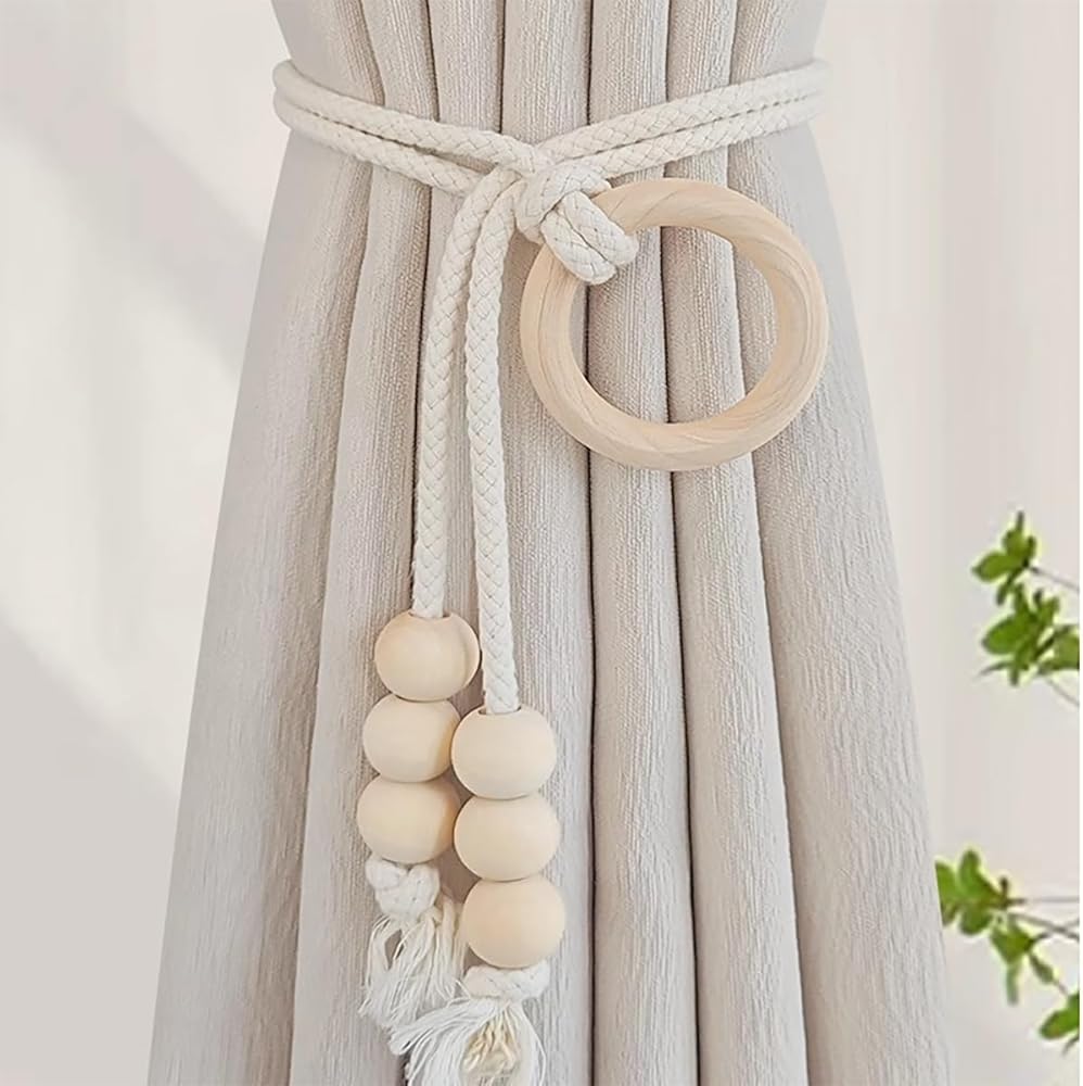 BOHEMIAN DESIGN: Handcrafted curtain tiebacks featuring natural wooden beads and cotton rope create an elegant boho-chic aesthetic for your window treatments