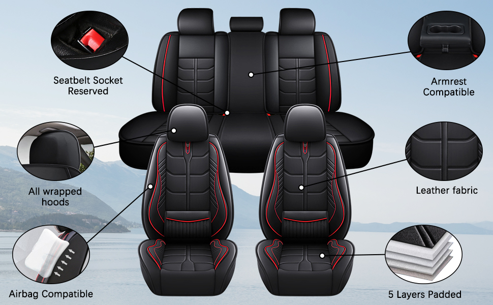 توافق ممتاز: تتميز أغطية المقاعد العالمية لدينا بتصميم مرئي فريد متوافق تمامًا مع أي وسائد هوائية مدمجة. جميع أبازيم أحزمة الأمان مكشوفة بالكامل لضمان سلامتك أثناء الاستخدام اليومي. مع مساحة تخزين مناسبة على جميع أغطية المقاعد، يمكن أيضًا أن تكون مساعدًا مفيدًا في حياتك أثناء القيادة.