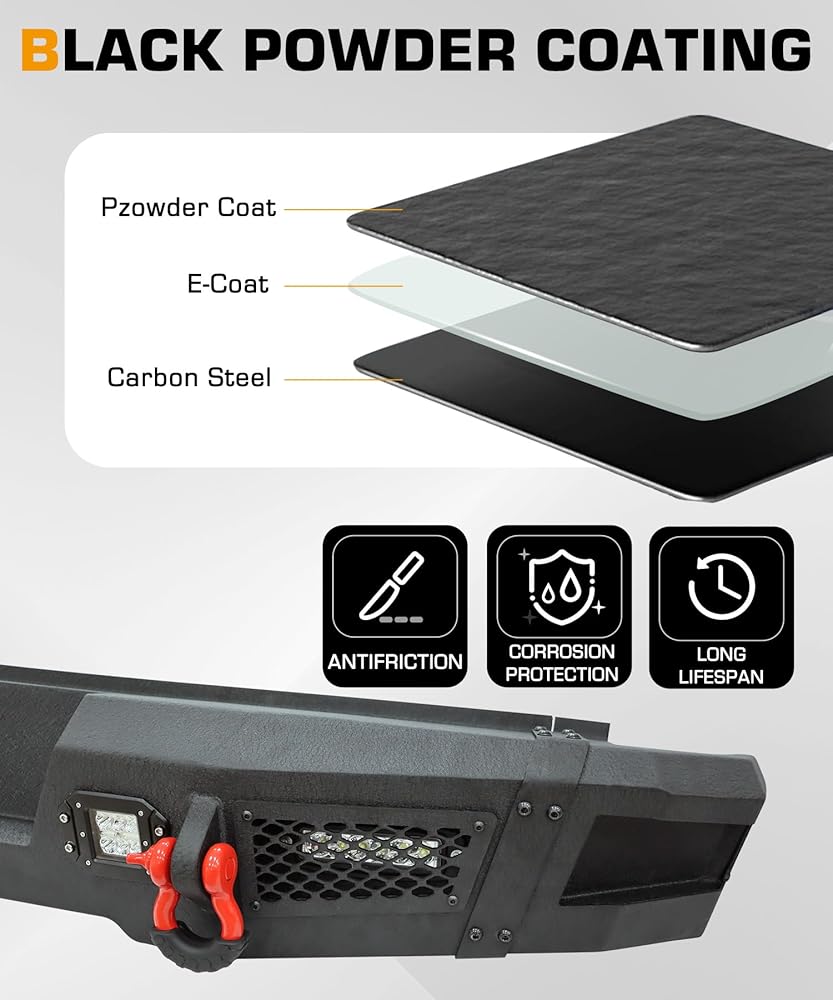 【MATERIAL】Made of heavty duty carbon steel, laser welding. Black powder coat allows the bumper having good performance on corrosion and scratches. Suitable for off-road use in different weather and environments.