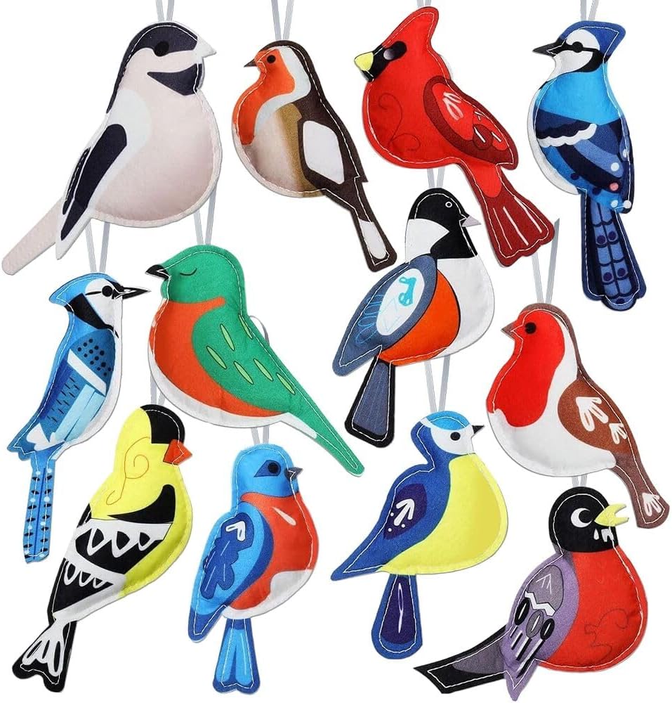 Bring the beauty of winter birds to your Christmas tree with this charming set of 12 felt ornaments. This delightful collection features beautifully crafted cardinals, woodpeckers, and goldfinches, each meticulously designed with vibrant colors and intricate details. The ornaments range in size from 0.74 to 2.75 inches, making them perfect accents for your holiday decorating. Each bird is made from soft, durable felt material and comes with a convenient hanging loop for easy display. The set includes various poses and designs, from bright red cardinals to striking blue and yellow goldfinches, creating a wonderful variety for your tree. These lightweight decorations are ideal for adding a natural, woodland touch to your Christmas decor, and they're also perfect for decorating winter baskets, wreaths, or garlands. The careful attention to detail in each bird's features makes them look lifelike while maintaining a cozy, handcrafted charm that adds warmth to your holiday display. These versatile ornaments can be clustered together for impact or spread throughout your tree for a cohesive, nature-inspired theme.
