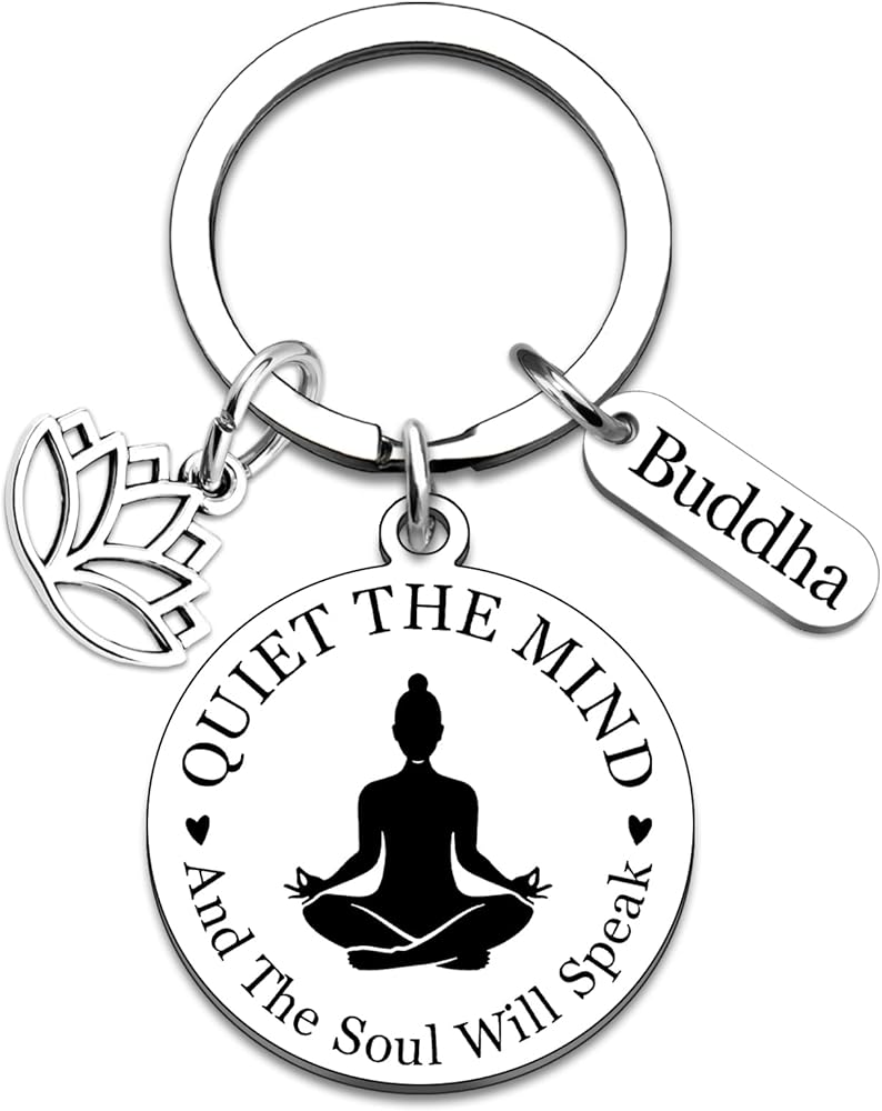 Yoga Gifts for Women: This yoga keychain showcases the timeless meditation mantra "Quiet the mind and the soul will speak". Complemented by subtle lotus flower motifs. Perfect gifts for people with anxiety