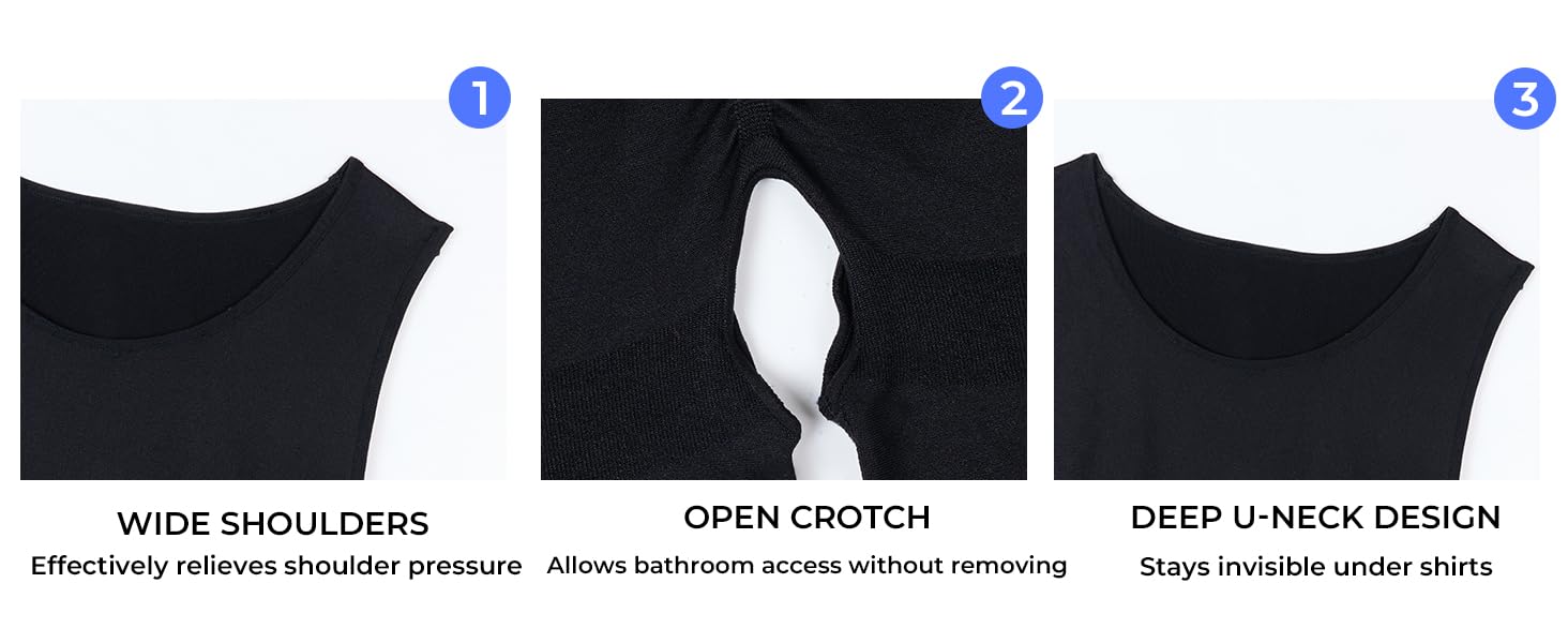 Invisible Underneath & Deep U-Neck Design: Maintain your secret with an invisible shapewear for men featuring a low-cut deep U-neck that stays hidden under any T-shirt, polo, or dress shirt. The wide-shoulder men's slimming undershirt design ensures the straps won't dig in or peek out, allowing you to wear it discreetly under your favorite professional or casual outfits.