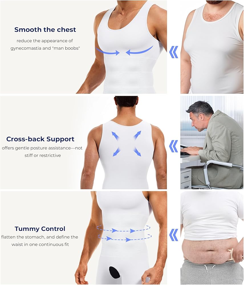Natural Gynecomastia & Abs Shaping: Achieve a more toned appearance with these gynecomastia compression shirts for men designed to flatten the chest and firm the stomach. This mens compression tank top uses balanced pressure zones to enhance your natural body lines without looking artificial, providing a boost of confidence for those dealing with "man boobs" or stubborn belly fat.