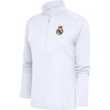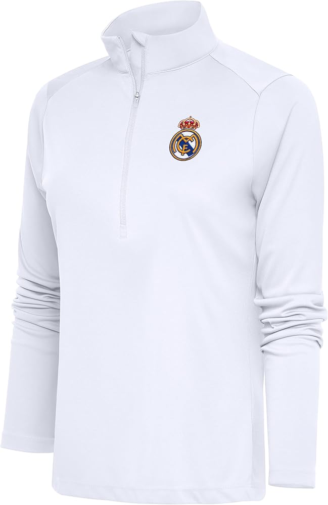 Elevate your athletic style with this classic Real Madrid Women's Tribute Half Zip Pullover. Crafted from premium 100% polyester interlock knit fabric (175gsm), this versatile pullover delivers exceptional moisture-wicking performance and easy maintenance. The thoughtfully designed self-fabric collar adds a refined touch, while the open cuff and hem ensure unrestricted movement during any activity. Perfect as a layering piece, this white pullover features the distinctive Antigua 'A' branding on the back neck, combining both style and functionality. The lightweight construction and breathable material make it an ideal choice for year-round wear, whether you're cheering from the stands or staying active in your daily routine. Available in various sizes, this pullover represents the perfect blend of comfort, performance, and team pride.