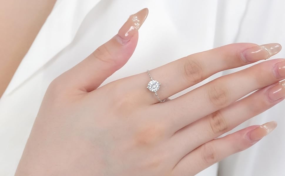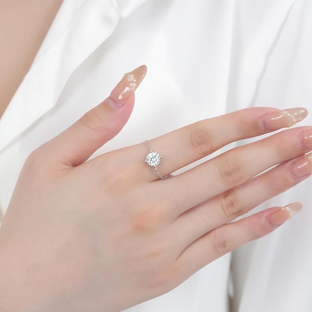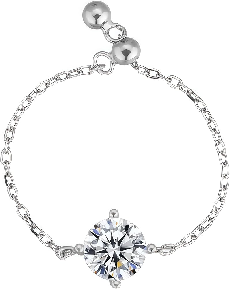 Elegant Design: A sterling silver ring featuring a single brilliant-cut round moissanite as the center stone. The band incorporates a delicate silver chain, seamlessly blending clean lines with contemporary elegance. Its adjustable design ensures a perfect fit for any finger size.