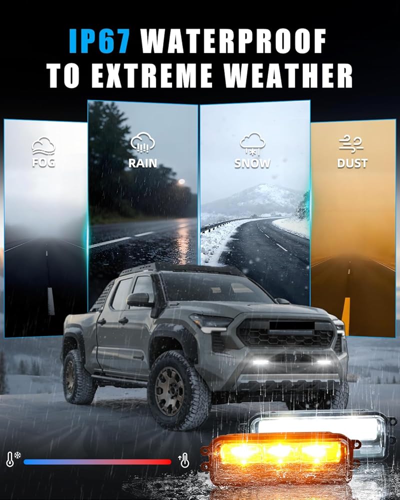 【Switchback Design】The fog lights combine two functions: white light as daytime running lights/driving lights and amber light as turn signal indicators, which expertly catches attention. Each fog light assembly is powered by high-power SMD LED and the LED light source is bright with stable light output. That consumes 70% less energy while remaining 3X brighter than the average light. They refresh your vehicle style and enhance your driving safety.