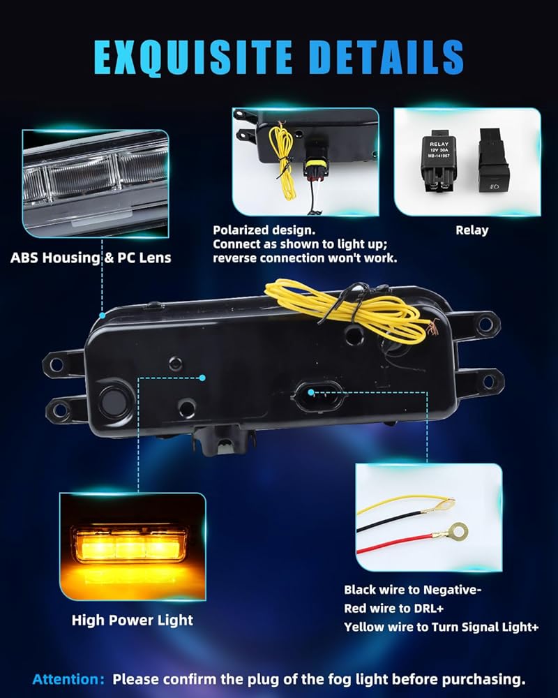 【Easy Installation】Just need to Connect black wire to the ground wire Negative-, Connect red wire to DRL+, Connect yellow wire to Turn Signal light +. Replace it with the new LED fog Lamps, and give your car a uniquely designed lighting effect. It's a hassle-free upgrade for an enhanced driving experience.