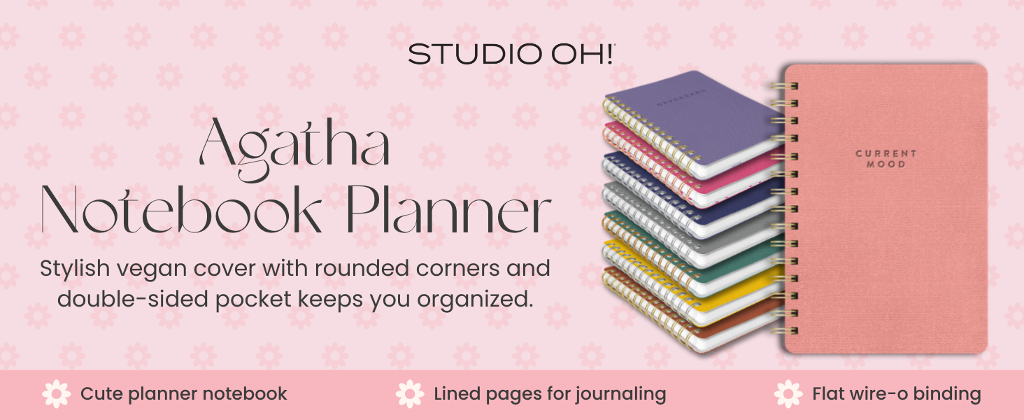 STYLISH PLANNER NOTEBOOK: Introducing Studio Oh's! Agatha Notebook - a modern take on traditional notebooks. This notebook planner features an attractive debossed artwork cover made from vegan material, stylish rounded corners, and a double-sided storage pocket allowing you to stay organized on-the-go.