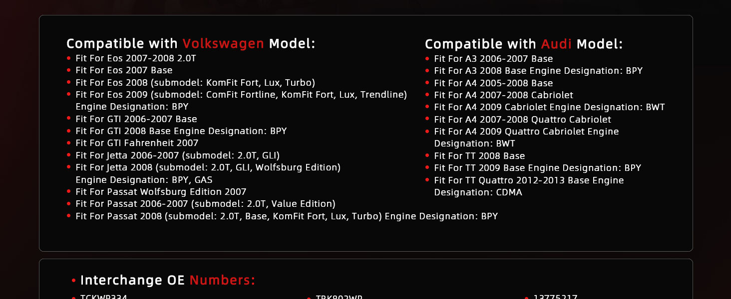 [Compatible Model]:Engine Timing Belt Kit with Water Pump fits for Audi A3 2006-2008, for A4 2005-2009, for TT 2008-2009, for TT Quattro 2012-2013 Base Engine Designation: CDMA, for Volkswagen Eos 2007-2009, for VW GTI 2006-2008, for Jetta 2006-2008, for Passat Wolfsburg Edition 2007, for Passat 2006-2008, Engine:2.0L