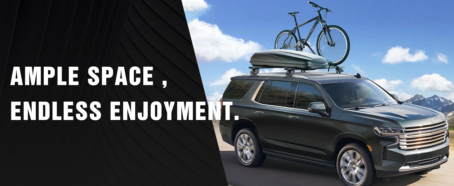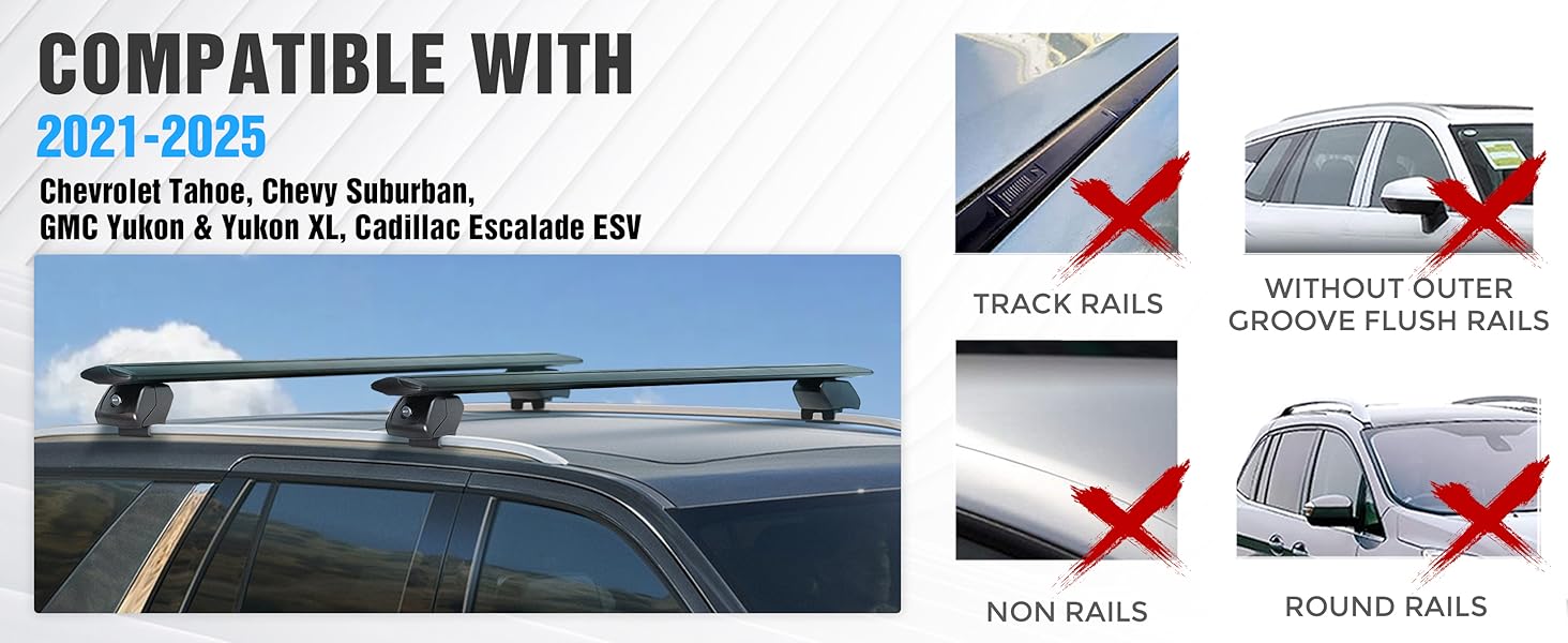 【Vehicle Fitment】: Our Roof Rack Cross Bars compatible for 2021 2022 2023 2024 2025 Chevrolet Tahoe, Chevy Suburban, GMC Yukon & Yukon XL, Cadillac Escalade ESV With Side Rails. Please check your vehicle's model and year before purchase.