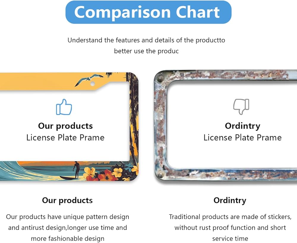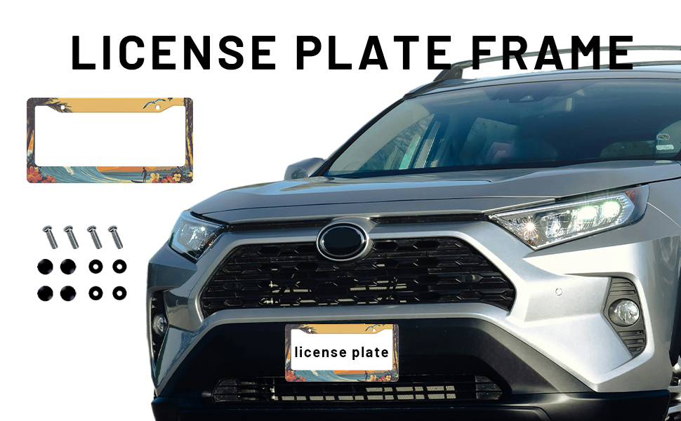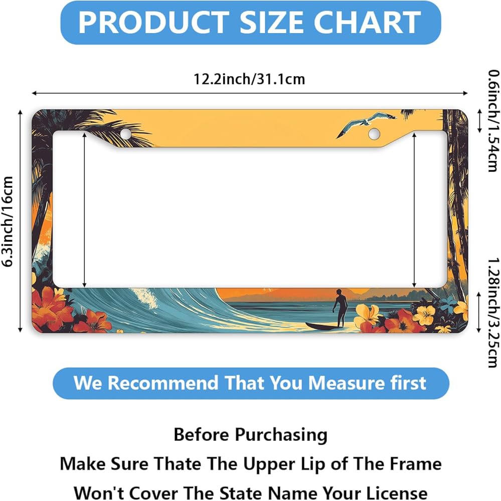 【Premium Aluminum Stainless Stee】Sunset Surf Wave license plates holders adapt multi-protection layer to ensure that there will be no fading or rust problems. Unique technology makes the surface more smooth. Made of high hardness and aluminum stainless stee, the material is light weight but still durable, which will protect better your license plates.