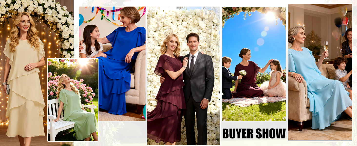 • Features: A modest fashionable Chiffon a line mother of the brides dresses with scoop neckline and flutter sleeves. The relaxed sheath skirt has a multi layer tier effect which elongates your silhouette.