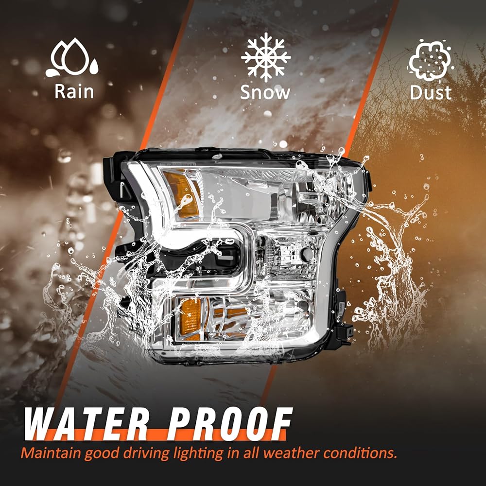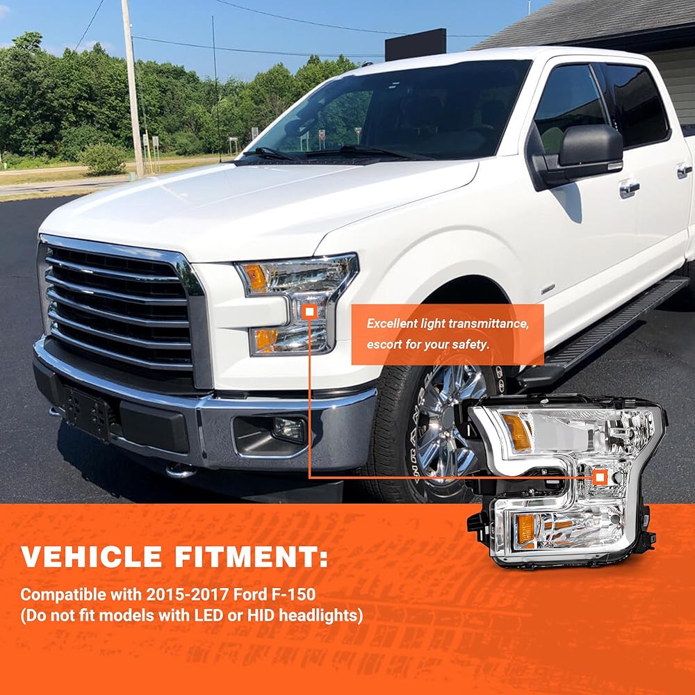 Headlight Assembly for 2015 2016 2017 Ford F150 with Chrome Housing Amber Reflector Driver and Passenger Side (Not compatible on models with LED or HID headlights)