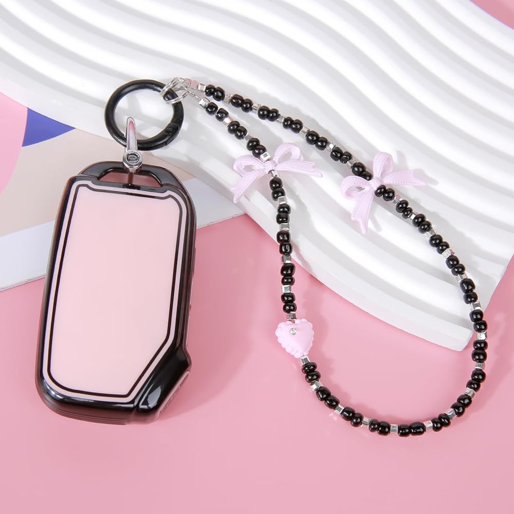 Compatible with Kia Key Fob Cover& Bow Wristlet, Fit for K5 Forte Sportage Soul Seltos Telluride Smart Key Holder 5 Buttons, Christmas Stocking Stuffers(Black&Pink)