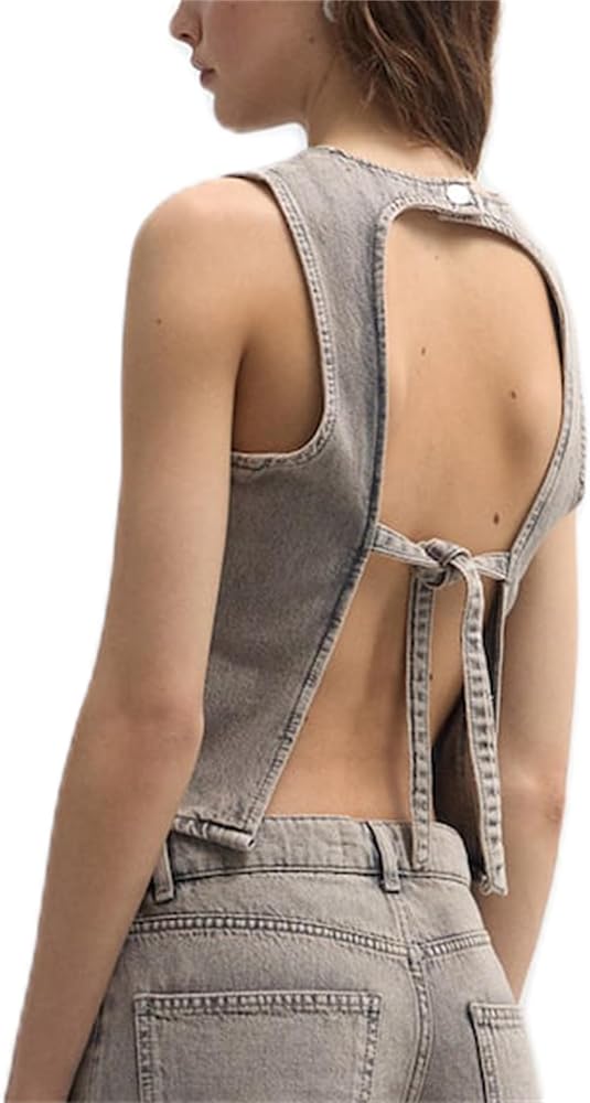 Feature: Denim halter tank tops for women, tie back button closure, relaxed fit and backless design, sexy sleeveless backless jean top, y2k open back lace up denim vest, solid color crew neck v neck jean tank tops, summer going out top for teen girls.