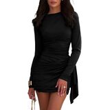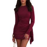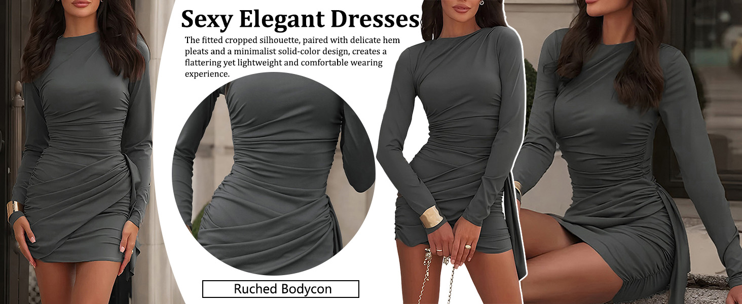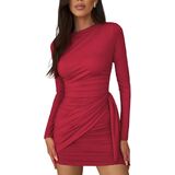 NRTHYE Ruched Bodycon Mini Dress for Women Sexy Elegant Long Sleeve Crew Neck Wrap Cocktail Party Short Dresses Clubwear